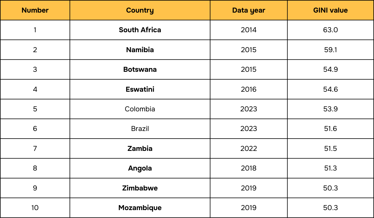 L'Afrique australe est de loin la région la plus inégalitaire du monde. Les dix premiers pays selon l'indice du coefficient de GINI de la Banque mondiale - qui mesure l'inégalité ou l'écart entre les citoyens les plus riches et les plus pauvres d'un pays - comprennent huit des dix pays de la région d'Afrique australe. Le Lesotho (20ème) et le Malawi (63ème) sont les deux seuls pays de la région à ne pas figurer parmi les dix premiers du monde.